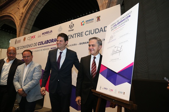 Este miércoles, el Mandatario capitalino y los presidentes municipales de Morelia, Alfonso Martínez Alcázar; de Durango, José Ramón Enríquez; de Colima, Héctor Insúa, y de Guadalajara, Enrique Alfaro, suscribieron el convenio de colaboración.