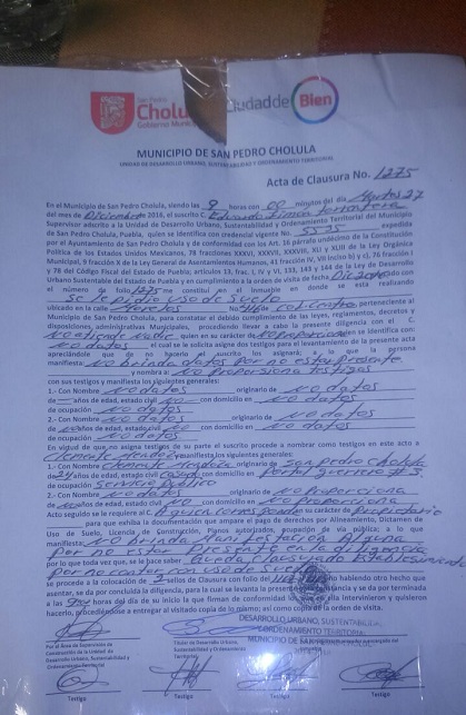 San Pedro Cholula.- El Presidente Municipal de San Pedro Cholula, José Juan Espinoza Torres, en forma arbitraria emprendió inmediatamente represalias en contra la familia Tecpanecatl Zacaula por haberlo denunciado por abuso de autoridad y violar sus derechos constitucionales y la mañana de este martes, antes de que abrieran los negocios, mando a un cuerpo de inspectores a clausurarlos, sin haber cumplido con la ley orgánica municipal.
