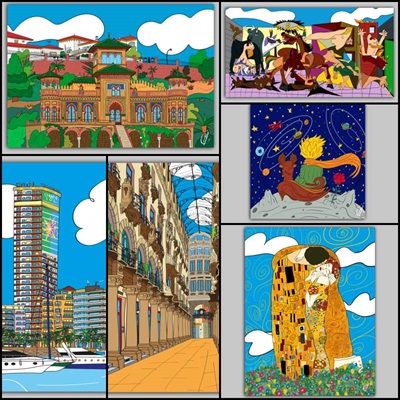 Para los que no me conocéis, -expresó Moisés Requena- estoy detrás de la marca More Creativo. Orgulloso de mi querida Mancha y mi pueblo Villarrobledo, cogí mi carpeta y mis lápices para estudiar Diseño Gráfico en Elche y me afinqué en Alicante. Así podréis entender el porqué de muchas de las zonas que veréis en esta exposición. Desde cualquier rincón de mi querido pueblo, hasta las bocas de metro de Madrid. Llenando de vida un cuadro tan estremecedor como el Guernica, dándole un nuevo sentido de esperanza y color que resurge después de tanto sufrimiento. Intentando que ese beso apasionado de Klimt se llene de luz con un gran cielo azul y unas nubes, marca de la casa. Dándole a las Meninas un toque más desenfadado, o reflejando las vidrieras llenas de color de La Casa de los Navajas de aquí de Torremolinos. Eso es More Creativo: Sencillo a simple vista, pero lleno de detalles y de formas irregulares, nunca me he sentido identificado con las reglas, pienso que todo lo que esté hecho a mano, debe tener sus “defectos” y es que ahí es donde está la esencia de esta marca, no es a escuadra y cartabón”.