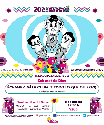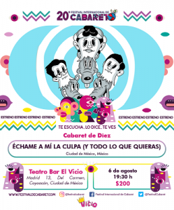El estreno de “ÉCHAME A MI LA CULPA (Y TODO LO QUE QUIERAS)” formará parte del 20º Festival Internacional de Cabaret presentando dos funciones: la primera, el domingo 06 de agosto, a las 19:30 hrs en el teatro bar El Vicio (Madrid 13, Colonia Del Carmen, Coyoacán), el espacio disidente, independiente, diverso, irreverente y plural; y la segunda, el martes 08 de agosto, en Tijuana. Adquiere tus boletos en: http://ficabechameamilaculpa.boletopolis.com/ (200 pesos entrada general); o reserva tus lugares en el WhatsApp de El Vicio: 5537533529 y recíbelos en la taquilla del teatro.