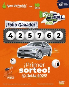 Con la rifa de un automóvil Volkswagen Jetta 2025, Agua Puebla para Todos llevó a cabo el primer evento del Sorteo del Pago Anual Anticipado 2025, resultando ganador el usuario con número de Folio 425762 y NIS 3077700.