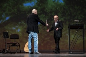 Málaga, España. - En el marco del 41 Festival de Teatro de Málaga, el actor Emilio Gutiérrez Caba recibe el Premio Málaga que concede el festival. El galardón se le entregó al finalizar el espectáculo poético-musical Decíamos ayer. Decimos hoy. El legendario actor recibió emocionado el premio y recordó que su bisabuelo inauguró el Teatro Cervantes y su familia se ha presentado en muchas ocasiones en este foro.
