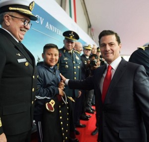 Ciudad de México.- El Presidente de la República, Enrique Peña Nieto, entregó un uniforme militar al niño tlaxcalteca José Ángel Aguilar Hernández, quien asistió como invitado especial a la ceremonia por el CV aniversario de la “Marcha de la Lealtad”, celebrada este viernes en la Ciudad de México.