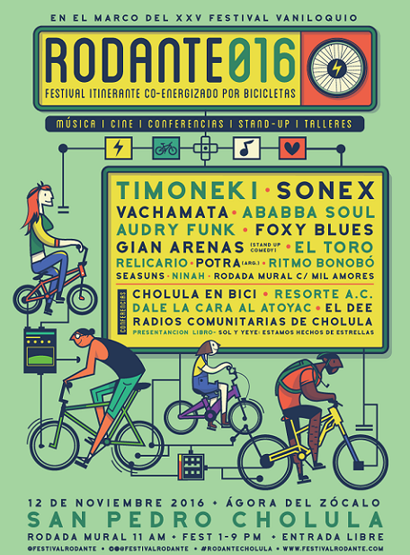 Rodante es un festival internacional de música, cine, stand-up comedy e innovación social con un sistema de sonido co-energizado por bicicletas.