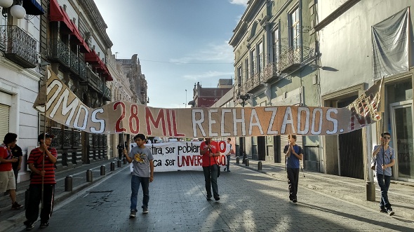 Puebla, Puebla. Agremiados a la Federación Nacional de Estudiantes Revolucionarios Rafael Ramírez (FNERRR) se unieron a la marcha de 15 mil poblanos rumbo a Casa Aguayo de este jueves, con la finalidad de exigir al gobierno del estado intervenga en obras públicas e infraestructura; establecimientos seguros para los comerciantes; la destitución del presidente municipal de Ocoyucan, Francisco Simarrón, por atropellos a la ciudadanía y educación, caso particular de los fenerianos.