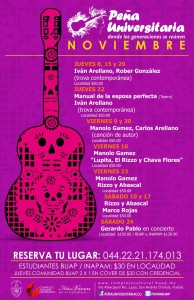 Los viernes del mes de noviembre serán muy versátiles, ya que tendrán diferentes programaciones musicales. Los viernes 9 y 30 de noviembre la Peña se llenará de la canción de autor de Manolo Gámez y Carlos Arellano; el viernes 16 Manolo Gámez comparte escenario con el espectáculo Lupita, El Rizzo y Chava Flores donde el dúo Rizzo y Abascal interpreta las canciones de este famoso cantautor mexicano.