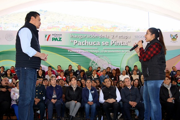 Pachuca, Hidalgo.- Como resultado del trabajo de una sociedad incluyente y altamente participativa en la tarea del rescate del tejido social, el Gobernador Omar Fayad acompañado del secretario de Gobernación Miguel Ángel Osorio Chong, pusieron en marcha la segunda etapa del programa “Pachuca se pinta”, para beneficio de los habitantes de la colonia Palmitas de la capital hidalguense.