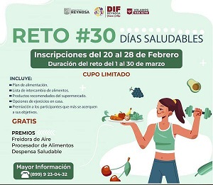 Reynosa, Tamaulipas.- El Sistema DIF Reynosa que encabeza Carlos Luis Peña Garza, invita a la ciudadanía a participar en el Reto 30 Días Saludables, que tiene el objetivo de fomentar mejores hábitos alimenticios y salud.