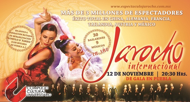 Jarocho Internacional regresa a Puebla después de siete años y por única función el próximo 12 de Noviembre, regresa al Auditorio del Complejo Cultural Universitario, con localidades que van desde los 600 hasta los mil 500 pesos, en un evento donde se apoyará a la Fundación Rotaria de Rehabilitación “Rómulo O´Farril” del Club Rotario de Puebla A. C.