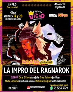 “LA IMPRO DEL RAGNAROK” llega al teatro bar El Vicio los próximos 14 y 28 de abril, llenando “tu cabaret de confianza” del misticismo y la competencia necesarios para dar vida a este show de improvisación teatral en el que se decidirá quién reinará la tierra por los próximos dos mil años. Los humanos tendrán una oportunidad para demostrar que son tan competentes como los dioses, mientras que las deidades intentarán mantener su poder. Aquel dios o humano que demuestre mayor destreza en la competencia será el que escriba la historia de aquí en adelante.