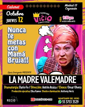 Asiste, disfruta y diviértete analizando la realidad en la última función de “LA MADRE VALE MADRE”, el jueves 12 de octubre, en el teatro bar El Vicio (calle Madrid 13, colonia Del Carmen, Coyoacán), a las 21:30hr. Adquiere tus boletos con un costo de $250 pesos la entrada general en:  http://nueprolamadrevalenadre.boletopolis.com/o reserva tus lugares en el WhatsApp de El Vicio: 5537533529 y recíbelos en la taquilla del teatro.