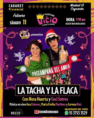 Prepárate para festejar de manera muy singular el Día del Amor y la Amistad al lado de tus personajes favoritos: la Tacha y la Flaca, en tu cabaret de confianza, el Teatro Bar El Vicio, donde, contagiadas por la locura del amor, y del alcohol, Nora Huerta y Cecilia Sotres, como un homenaje a la Guayaba y la Tostada (las borrachitas callejeras salidas de la trilogía de la famosa película del cine de oro “Pepe el Toro”), nos harán reír y reflexionar alrededor del significado y las consecuencias de este amoroso mes, y, de pasadita, desmenuzarán la compleja situación acerca de cómo va la política del día a día en nuestro país, pero eso sí… todo aderezado con estupendos momentos musicales.