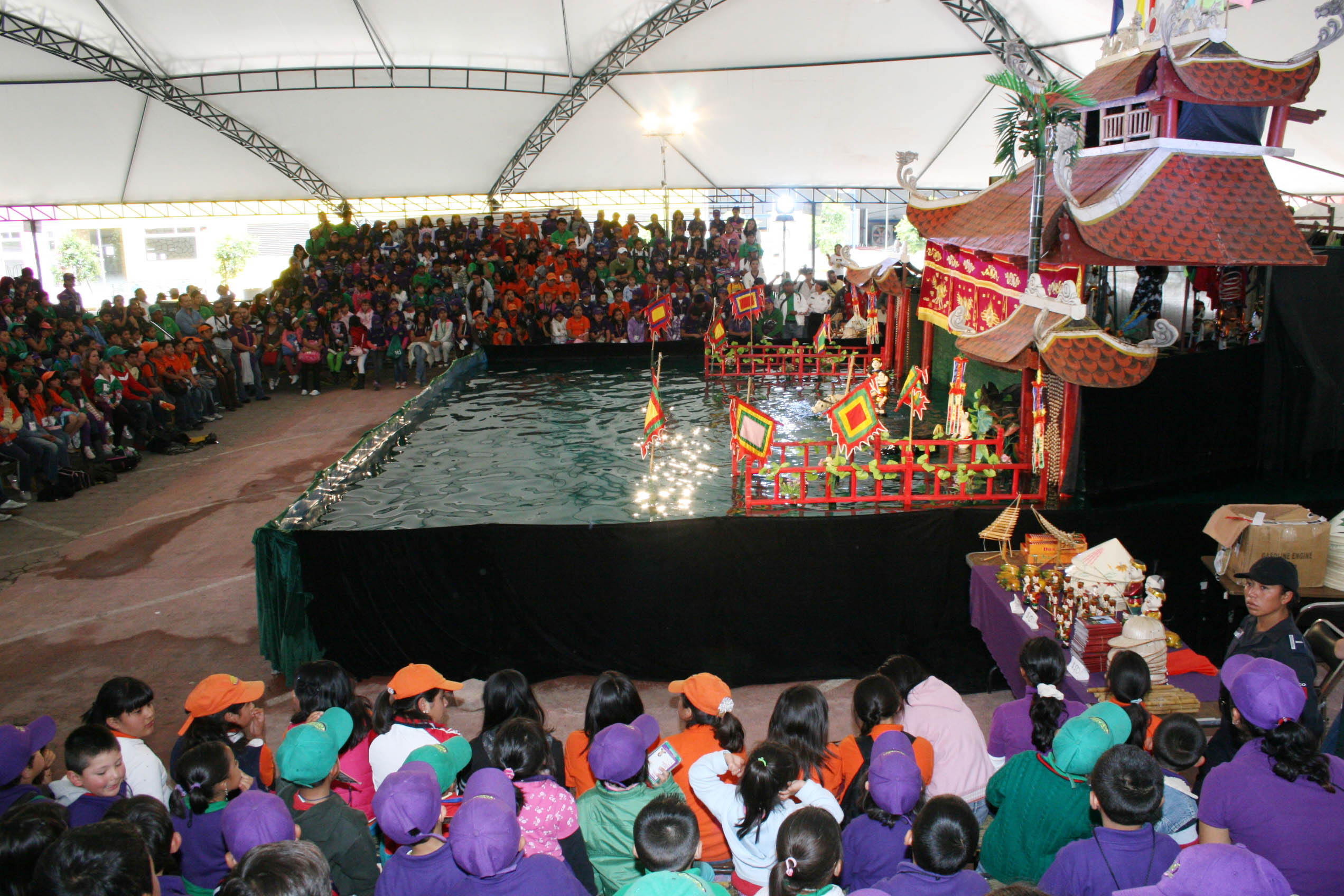 Al iniciar la puesta en escena de las Marionetas Acuáticas de Vietnam los niños y niñas fueron cautivados con el espectáculo, que se acompaña de música tradicional vietnamita y fantásticos muñecos de pasta que surcan el agua, y que son controlados con largos palos de madera.