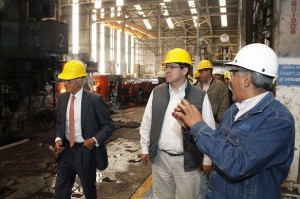 Acompañado por Rufino Vigil González y Luis García Limón, Presidente del Consejo de Administración y Director Corporativo de Grupo Simec, respectivamente, Marco Mena visitó los hornos de fundición y laminación de la empresa que actualmente produce 400 mil toneladas de acero.