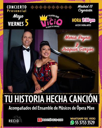 María Reyna y Joaquín Garzón te esperan en el teatro bar El Vicio (Madrid 13, Colonia Del Carmen, Coyoacán), el viernes 05 de mayo, a las 21:30Hrs, en una prometedora e inolvidable noche de remembranza, reencuentro y acercamiento con el público, que podrá gozar, en vivo, del bel canto de esta extraordinaria y talentosa soprano que lleva su región en la voz, al ir del susurro entre las copas de los árboles, al canto de las aves, creando y recreando no solamente la música mixe original, sino enriqueciéndola con fusiones y ensambles de otros géneros. Adquiere tus boletos para escuchar sus magníficas interpretaciones en https://boletopolis.com/es/evento/26033 (400 pesos entrada general y 350 en preventa), o reserva tu lugar en el WhatsApp de El Vicio: 5537533529 y adquiérelos directamente en la taquilla del teatro.