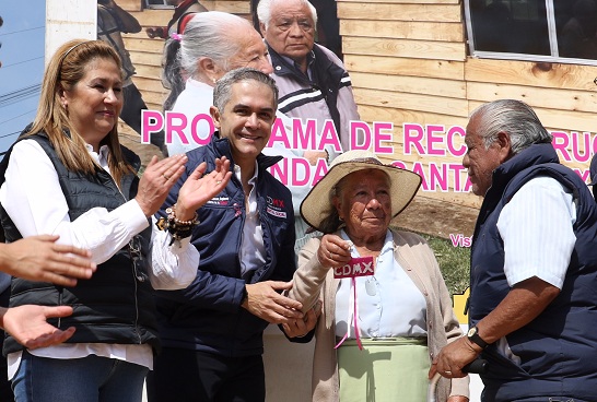 El mandatario capitalino entregó la llave de la primera casa antisísmica modelo “Cabaña” a los señores Pedro Mendieta y Josefa Huerta. Además del equipamiento para su vivienda que consta de: refrigerador, estufa, colchón, lavadora, sistema de captación pluvial, batería de cocina y vajilla.
