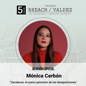 Nuestra IBERO, junto con diversas organizaciones e instituciones nacionales e internacionales dedicadas a los derechos humanos, anunciaron este 3 de mayo a las personas ganadoras de la quinta edición del Premio Breach/Valdez de Periodismo y Derechos Humanos. Entre ellas, Mónica Cerbón, egresada del programa Prensa y Democracia (PRENDE) Ibero, obtuvo mención especial por su trabajo Zacatecas: el nuevo epicentro de las desapariciones, publicado en Quinto Elemento Lab.
