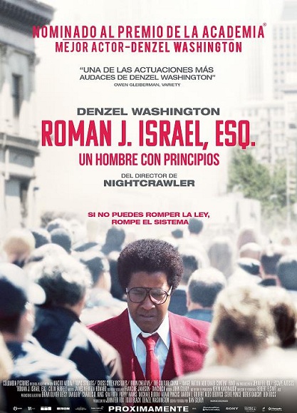 Sinopsis: Roman J. Israel, Esq. se sitúa en el lado oculto del saturado sistema penal de Los Ángeles. Denzel Washington interpreta a un abogado defensor idealista y con vocación, cuya vida cambia drásticamente cuando su mentor, un icono de los derechos civiles, muere.
