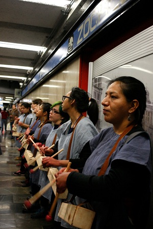 El colectivo se dividió en 12 grupos, distribuidos en cada una de las Líneas del Metro, encabezados por una líder, quienes intervinieron la réplica de un tambor Tarahumara.