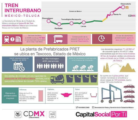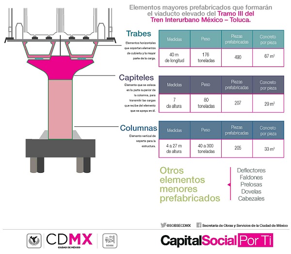Para el tramo III del Tren Interurbano México–Toluca se fabrican 205 columnas, 490 trabes y 207 capiteles, elementos mayores que dan el soporte a la estructura; asimismo, se elaboran los 24 mil elementos menores complementarios. Para la construcción de los mismos se requieren 71 mil 903 metros cúbicos de concreto, lo que equivale a 10 mil 271 ollas mezcladoras.