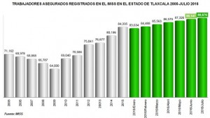 De acuerdo con la base de datos del Instituto Mexicano del Seguro Social (IMSS), al cierre de julio pasado, Tlaxcala logró un nuevo máximo histórico en el número de trabajadores afiliados, al sumar 88 mil 676.