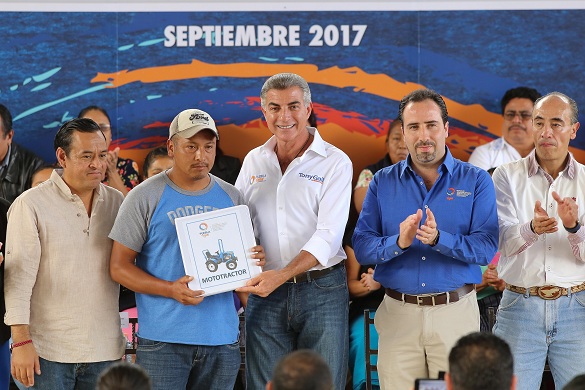 Chiconcuautla, Puebla.- El Gobernador Tony Gali realizó la entrega regional de Insumos a Tiempo, así como de los primeros tractores ligeros, módulos acuícolas, estufas ecológicas y animales para reproducción, que beneficiarán a cuatro mil 56 productores de la Sierra Norte.
