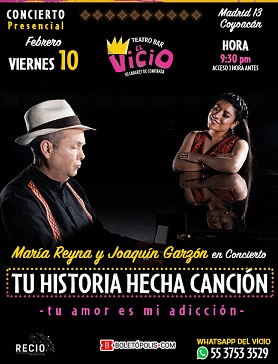 El teatro bar El Vicio se viste de gala y se llena de orgullo al presentar el concierto: “TU HISTORIA HECHA CANCIÓN” -tu amor es mi adicción-, en donde cada canción será una historia, y en donde el público podrá disfrutar de las historias vivas de los grandes maestros e historias nuevas, en la voz de la soprano mixe María Reyna y el piano de Joaquín Garzón, quienes nos deleitarán con una noche de exquisita Bohemiología.