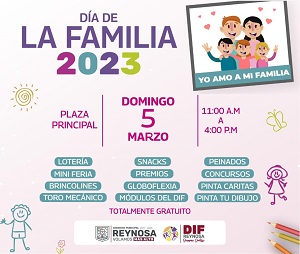 Reynosa, Tamaulipas. – El Sistema DIF Reynosa que encabeza Carlos Luis Peña Garza y el Ayuntamiento, invitan a los ciudadanos a disfrutar del evento del Día de la Familia que se realizará este domingo 05 de marzo.