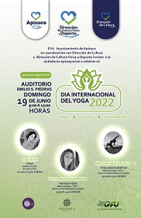 Apizaco, Tlaxcala.- El presidente municipal de Apizaco, Lic. Pablo Badillo Sánchez en beneficio social invita a la ciudadanía a formar parte de la celebración por el Dia Internacional del Yoga que se llevará acabo de forma gratuita en el Auditorio Emilio Sánchez Piedras, el día domingo 19 de junio del 2022 en coordinación con Dirección de Cultura y Turismo a cargo de la Lic. Ma. Fabiola Camarillo Sánchez y Dirección de Cultura Física y Deporte a cargo del Lic. José Alain Montiel Hernández. Con actividades desde las 9:00 hrs y hasta las 15:00hrs con clases gratuitas por diversos instructores cada hora.