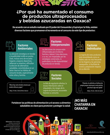 Al respecto, Jorge Vargas, investigador de El Poder del Consumidor, comentó: “Las enfermedades crónicas no transmisibles son una de las mayores amenazas para la salud pública en Oaxaca, debido a la gran presencia que tienen en la mortalidad del estado. La prevalencia de estas enfermedades se relaciona directamente con el entorno, ya que hay un fácil acceso a productos ultra procesados y bebidas azucaradas.”