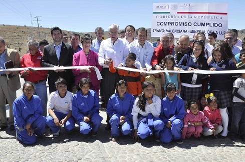 El Secretario Ruiz Esparza cortó el listón inaugural del tramo La Valenciana-Mineral de La Luz junto con el gobernador guanajuatense, niños y mujeres de la localidad, estudiantes de la telesecundaria 441 Mineral de Santa Ana y del bachillerato SABES, principales beneficiados con esta obra.