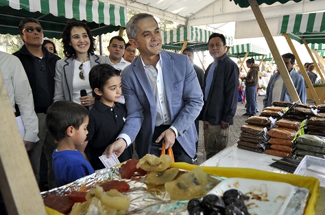 Antes, el Jefe de Gobierno aprovechó su visita al Bosque de Chapultepec para acudir al Mercado de Trueque, al que asistieron miles de capitalinos este domingo para intercambiar sus residuos sólidos por vegetales, plantas, quesos y otros productos.