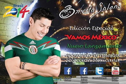 México se encuentra con la pasión futbolera a flor de piel, gracias al Mundial que se celebra en Brasil y uno de esos hinchas es el cantante Ernesto Solano, ex vocalista de la Banda Maguey, quien se declara aficionado a este deporte desde temprana edad, tan es así que militó en el Club Deportivo Guadalajara, y tras decidirse por una carrera musical hoy manda su apoyo a los jugadores de la Selección Mexicana, con un nuevo tema titulado “Vamos México”, el cual es un adelanto de lo que será su próximo material discográfico.