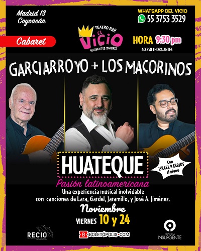 Una velada que promete ser desenfadada y llena de anécdotas, con las que se dará fe del proceso creativo al mostrar una nueva faceta del Tenor mexicano Rodrigo Garciarroyo, eso es “HUATEQUE”. Toda una experiencia musical inolvidable en colaboración con el afamado dueto de guitarristas Los Macorinos, quienes han colaborado con artistas como Chavela Vargas, Lila Downs y Natalia Lafourcade; y músicos invitados de primera.