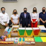 Representando al complejo mercantil del ramo de refrescos, Juan José Garza Acosta, e Iván Moreno Gómez, entregaron en sus instalaciones del parque Villa Florida, a la Secretaría de Desarrollo Social, los útiles escolares como libretas, colores, crayolas, lápices y sacapuntas.