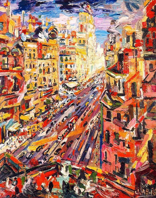 Hoy recuerdo esa fuerza creadora y muero de ilusión. Volví un par de meses después a México pero con la fuerza espiritual que adquiere sobre un tema todo aprendiz del buen maestro. Una fuerza sobre aquella enseñanza que daba a manos llenas y sin maña alguna, evitando por siempre introducir a sus admiradores en confusos recovecos donde solamente se suele prometer y jurar para ganar. Abelló no quería convencer, él sabía muy bien cómo manifestarse, y ha sido aquello del maestro, lo que hoy sigue latente en mí. En fin, unos cuantos años después y por cosas del destino, vivía yo en Madrid, cuando escuché en las noticias de la radio que aquel mismo día se le daría al maestro un hermoso adiós; ese día había muerto, se había ido uno de los eslabones del arte del siglo XX español y al enterarme, desplegué la mirada hacia el cielo, pude ver un delicioso paisaje, en tonos rojo ocre, y azul opalino cuando se me erizó la piel, puesto que bien sabía yo, que era ya aquel genio, una estrella más en las venas del firmamento, y que su mirada, como la del esteta amante de los colores, por siempre vivirá en cada uno de sus oleos.