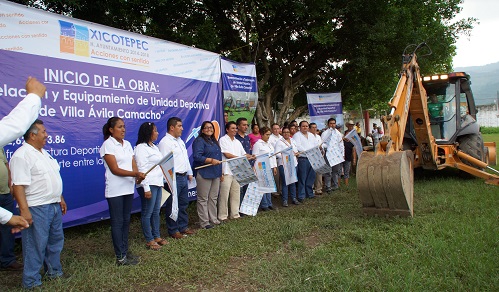 XICOTEPEC.- Representantes del H. Ayuntamiento de Xicotepec, asistieron a la Junta Auxiliar de Villa Ávila Camacho para dar inicio a la obra de remodelación y equipamiento de la unidad deportiva de la localidad.