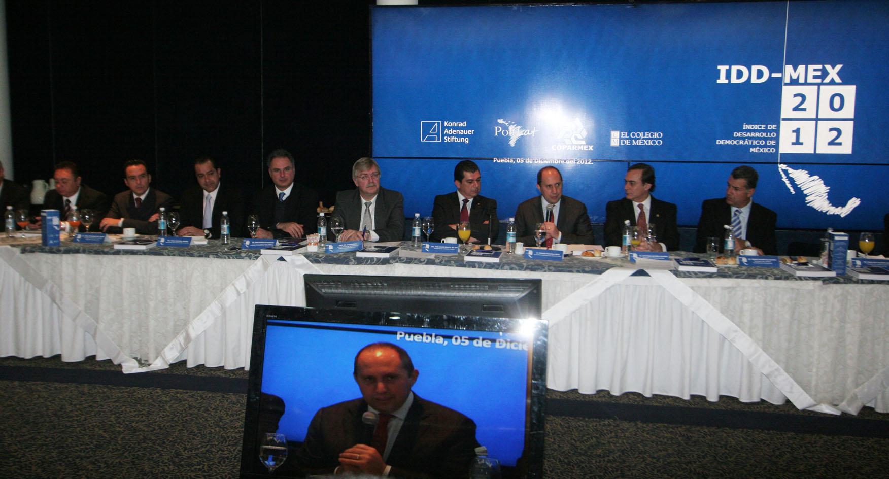 Puebla, Pue. Este miércoles 5 de diciembre se llevó a cabo en el hotel Presidente Intercontinental la presentación de los resultados del Índice de Desarrollo Democrático de México edición 2012. Asistieron a esta exposición el Secretario General de Gobierno Fernando Manzanilla Prieto; Stefan Jost, Representante de la Fundación Konrad Adenauer; el Presidente nacional de COPARMEX, Juan Pablo Castañón Castañón; el Director de la Agencia Polilat, Jorge Arias; Franco Rodríguez Álvarez, Presidente del Consejo Coordinador Empresarial; Pablo Rodríguez Regordoza, Secretario de competitividad, trabajo y desarrollo económico, así como Rectores de Universidades, Presidentes de Partidos Políticos en Puebla y empresarios poblanos.