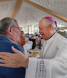 Con paso lento y apoyado en un bastón el arzobispo recorrió algunas mesas saludando a sus invitados, hasta llegar al sitio desde el cual realizó la bendición de los alimentos que llevaban en las viandas a cada una de las mesas.