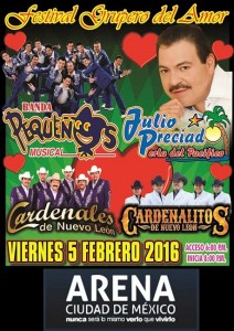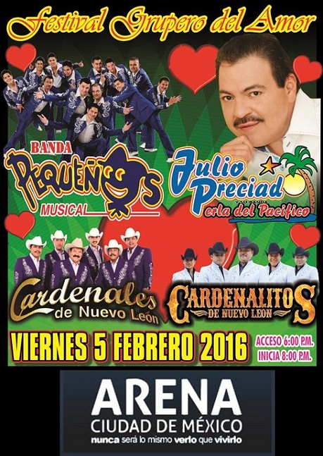 Pequeños Musical, Julio Preciado y su banda Perla del Pacífico, Cardenales de Nuevo León y Cardenalitos de Nuevo León, serán las bandas que engalanarán el Festival Grupero del Amor, que se llevará a cabo el próximo 5 de Febrero, en la Arena Ciudad de México.