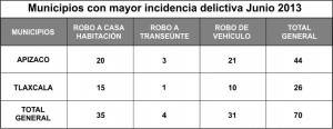 Es importante destacar que de acuerdo al análisis mensual que realiza la Secretaria de Seguridad Pública, el índice delictivo en Tlaxcala es menor al que registra el vecino municipio de Apizaco, el cual en el mes de Junio registró 44 puntos mientras que la capital 26.