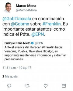 En su cuenta de Twitter, el Gobernador Mena escribió: @GobTlaxcala en coordinación con @Gobmx sobre #Franklin. Es importante estar atentos, como indica el Pdte. @EPN.